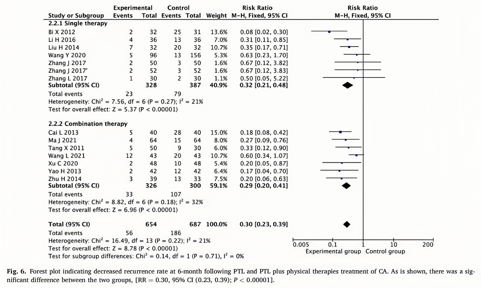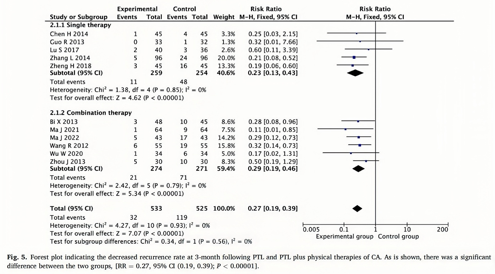 11 studies reported the recurrence rate at 3-month follow-up(Chen and Chen,2014;Guo,2013;Lu,2017;Ma et al.,2021,2022;Bi et al.,2013;Wang et al.,2012;Wu et al.,2020;Zhang,2014;Zheng et al.,2018; Zhou,2013),including 5 using PTL along and 6 using PLT in combination with other therapies.For a low heterogeneity,the fixed-effects model was used.In the PTL groups,the 3-month recurrence rate was 4.25%(11/259),and that of the control group was 18.9%(48/254). The comparison between the two groups was statistically significant(RR=0.23,95% CI[0.13,0.43];P<0.00001).In the combination groups,the 3-month recurrence rate of PTL was 7.66%(21/274)and that of the control group was 26.20%(71/271).The comparison between the two groups was statistically significant(RR=0.29,95% CI[0.19,0.46];P < 0.00001).The results of the meta- analysis showed that PTL could significantly reduce the recurrence rate of CA patients at 3-month follow-up(RR=0.27,95% CI[0.19,0.39];P<0.00001),and the effect of the PTL groups was similar to that of the combination groups.(Fig.5).