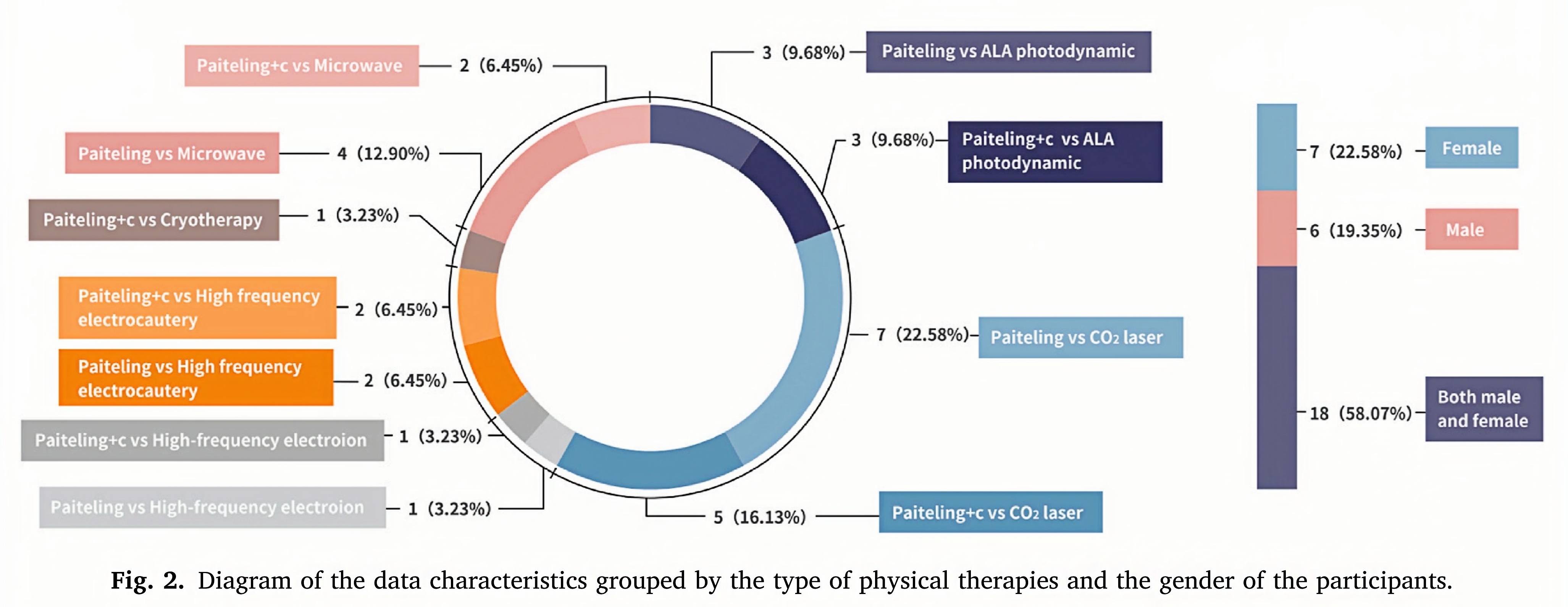 Of all, 17 trials compared PTL alone with physical therapies, and 13 compared PTL plus physical therapies with physical therapies. The types of physical therapies in the studies can be divided into 12 studies using CO2 laser therapy(Tang and Jin, 2011; Wang et al.,2012;Zhou,2013;Cui,2018;Cai et al.,2013;Chen and Chen,2014;Huang,2009;Zhang,2014,2017b;Li, 2016;Guo, 2013; Ma et al., 2022),6 using ALA photodynamic therapy(Liu,2014;Li,2018;2017a; Lu,2017;C.C Xu et al.,2020;Bi et al.,2013),6 using microwave therapy(Yao and Zhang,2013;Zhang et al.,2017;Ma et al.,2021;Wang et al.,2020a;Zhu and Li,2010;Cheng,2018),4 using high-frequency electrocautery(Zhu,2008;Zheng et al.,2018;Wang et al.,2020b;Zhu and Xin,2014),2 using high-frequency electroionization(Wu et al.,2020;Bi,2012),and 1 using cryotherapy (Wang et al.,2021b).As for the gender of the subjects,it can be further divided into 6 with male subjects(Chen and Chen,2014;Guo,2013;Li, 2018;Lu,2017;Wu et al.,2020;Zheng et al.,2018),7 with female subjects (Huang,2009;Tang and Jin,2011;Wang et al.,2021a;Wang et al.,2012;Yao and Zhang,2013;Zhu and Li, 2010;Zhang,2014),and the other 18 with both male and female subjects. The basic characteristics of physical therapy and gender are shown in Fig.2.