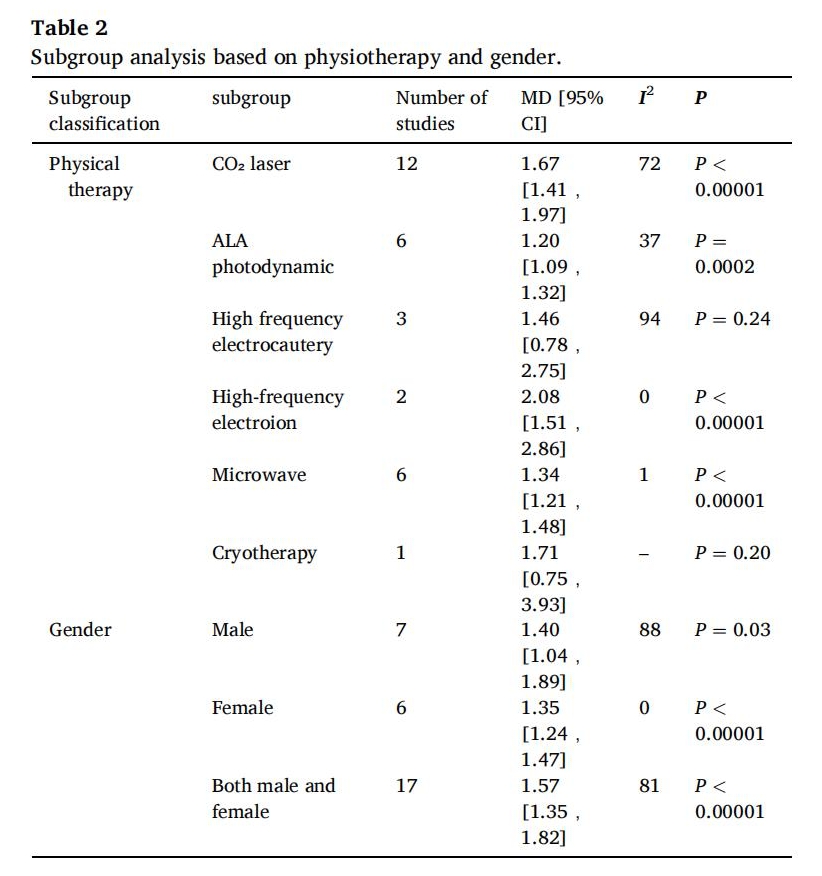 The results indicate that the heterogeneity of the ALA photodynamic therapy(P=0.16, I2=37%),high-frequency electroion therapy(P=0.35, I2=0%)and microwave therapy(P = 0.41,I2=1%) groups was significantly reduced,compared to the CO2 laser therapy(P<0.0001,I2=72%)and high-frequency electrocautery therapy (P<0.00001,I2=94%).However,since only one study was included in the cryotherapy group,the heterogeneity analysis was not performed for this type of treatment.Overall,the random effect model was used for consolidation.These findings suggest that different physical therapies in the control group may have a significant impact on the results of the meta-analysis.At the same time, since the experimental groups were intervened with PTL or PTL plus physical therapies, the control groups received various physical treatments, the subgroup analyses also indirectly compared the efficacy of the physical therapies. As shown in Table 2., the effectiveness of ALA photodynamic therapy was comparable to that of PTL(RR =1.20,95% CI [1.09,1.32];P=0.0002),while high frequency electroion therapy(RR=2.08,95% CI[1.51,2.86];P<0.00001),CO2 laser therapy(RR=1.67,95% CI[1.41,1.97];P<0.00001)and microwave therapy(RR=1.34,95% CI[1.21,1.48];P< 0.00001)were less effective than PTL,and the difference was statistically significant.