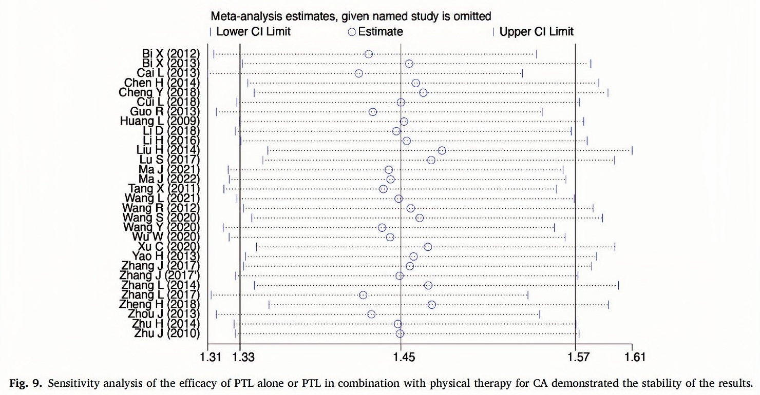 We conducted a comprehensive data analysis using Revman 5.4 and Stata 15.0.Continuous outcomes were expressed as mean difference(MD)with 95% confidence intervals (CI) between the experimental and control groups, and dichotomous data were presented as risk ratios(RR)with 95% CI. We evaluated heterogeneity using the I2 statistic, with low heterogeneity considered as I2<50% and high heterogeneity as I2>50%.If heterogeneity was low,we applied a fixed-effects model for the meta-analysis,and if not,a random-effects model was utilized.To explore the source of heterogeneity and assess the robustness of the results,we performed subgroup and sensitivity analyses. Subgroup analyses were pre-specified based on the type of interventions (PTL versus physical therapies, PTL plus physical therapies versus physical therapies) and post-hoc subgroups were based on the type of physical therapy and the gender of subjects. Publication biases were assessed by conducting funnel plots, egger’s test,and begg’s test (P value represents the significance of bias,P<0.05 indicates significant publication bias,otherwise, no significant bias).If the funnel plot was symmetrical,it indicated the absence of publication biases, while any asymmetry was analyzed using the trim and fill method to assess the impact of publication biases. If the change in CI before and after applying the trim and fill method is less than 1, this indicates that publication bias has little impact and the results are relatively robust.