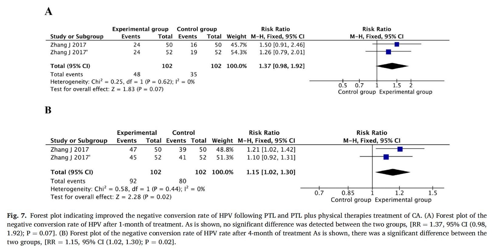 2 studies reported the negative conversion rate of HPV after 1 and 4months of treatment (Zhang,2017a;Zhang et al.,2017).The heterogeneity test showed that there was no significant heterogeneity between them,so the fixed effect model was used.Compared with the control group,after 1 month of treatment,the negative conversion rate of HPVin the experimental group was equivalent to that in the control group,with no significant difference(RR=1.37,95% CI[0.98,1.92];P= 0.07)(Fig.7A).However,after 4 months of treatment,the negative conversionrate of HPV in the experimental group was 1.15 times higher than that inthe control group(RR=1.15,95% CI[1.02,1.3];P=0.02),with astatistically significant difference (Fig.7B).Therefore,we speculatedthat prolonging the use of PTL according to the patient‘s conditions has aprotective effect on improving the negative conversion rate of HPV andtreatment efficacy.