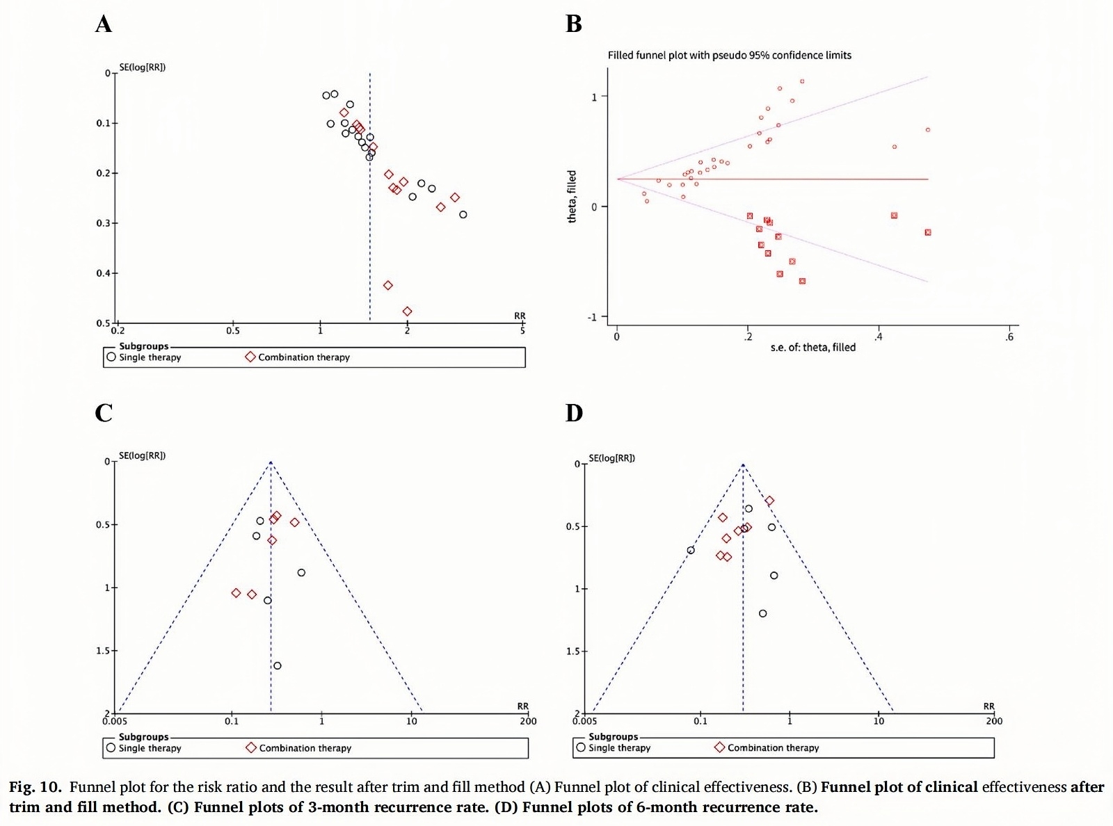 To determine whether any individual study can influence the overall pooled results, sensitivity analysis was performed by sequentially omitting one study at a time. The result showed that the 95% CI was consistent and overlapped extensively, indicating that the meta-analysis results were largely stable(Fig.9).Publication biases were examined for both clinical effectiveness and recurrence rate. The funnel plot of clinical effectiveness was asymmetrical(Fig.10A) and the begg’s and egger’s tests showed a significant publication bias(P<0.05),which might be due to the lowquality of the included studies,small sample sizes,small negative results.When there are publication biases,the trim and fill method was applied to further analyze,and the results showed that publication biases had a minimal effect and the results were mostly stable.Before applying the trim and fill method,Q=95.638 (P=0),the combined result for clinical effectiveness was log RR=0.37(95% CI[0.29,0.45]).After six iterations using the linear method,we obtained the following results,the number of missing trials was estimated to be 12,the heterogeneity was Q=152.82(P=0) and the combined result was log RR=0.25(95% CI[0.16,0.33])(Fig.10B).The funnel plot was drawn based on the recurrence rate at 3-month and 6-month,which showed basic symmetry(Fig.10C and D).Begg’s bias test (P3-month=0.640>0.05, P6-month = 0.58>0.05) and egger’s bias test (P3-month=0.513>0.05, P6-month=0.27>0.05)also indicated that there was no significant publication bias.